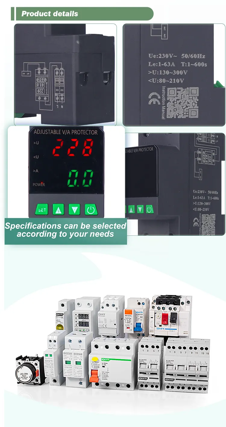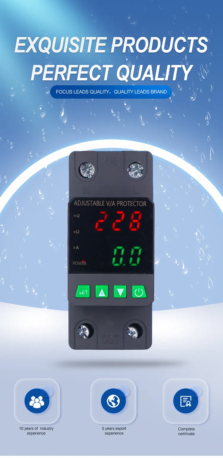 டிஜிட்டல் டிஸ்ப்ளே பொருத்தப்பட்ட மற்றும் இறக்குமதி செய்யப்பட்ட மட்டு மின்னணு கூறுகளுடன் தயாரிக்கப்படுகிறது, இது அதிக நம்பகத்தன்மை மற்றும் செயல்திறனைக் கொண்டுள்ளது. அசாதாரண மின்னழுத்தங்களின் போது (ஓவர்வோல்டேஜ், அண்டர்வோல்டேஜ் அல்லது கட்டம் ஏற்ற இறக்கங்கள் போன்றவை) பாதுகாப்பான் தானாகவே மற்றும் விரைவாக மின்சார விநியோகத்தை துண்டிக்கிறது மற்றும் மின்னழுத்தம் இயல்பு நிலைக்கு திரும்பிய பின் மின்சார விநியோகத்தை மீட்டெடுக்கிறது.