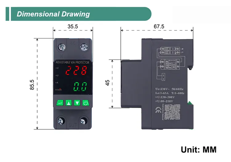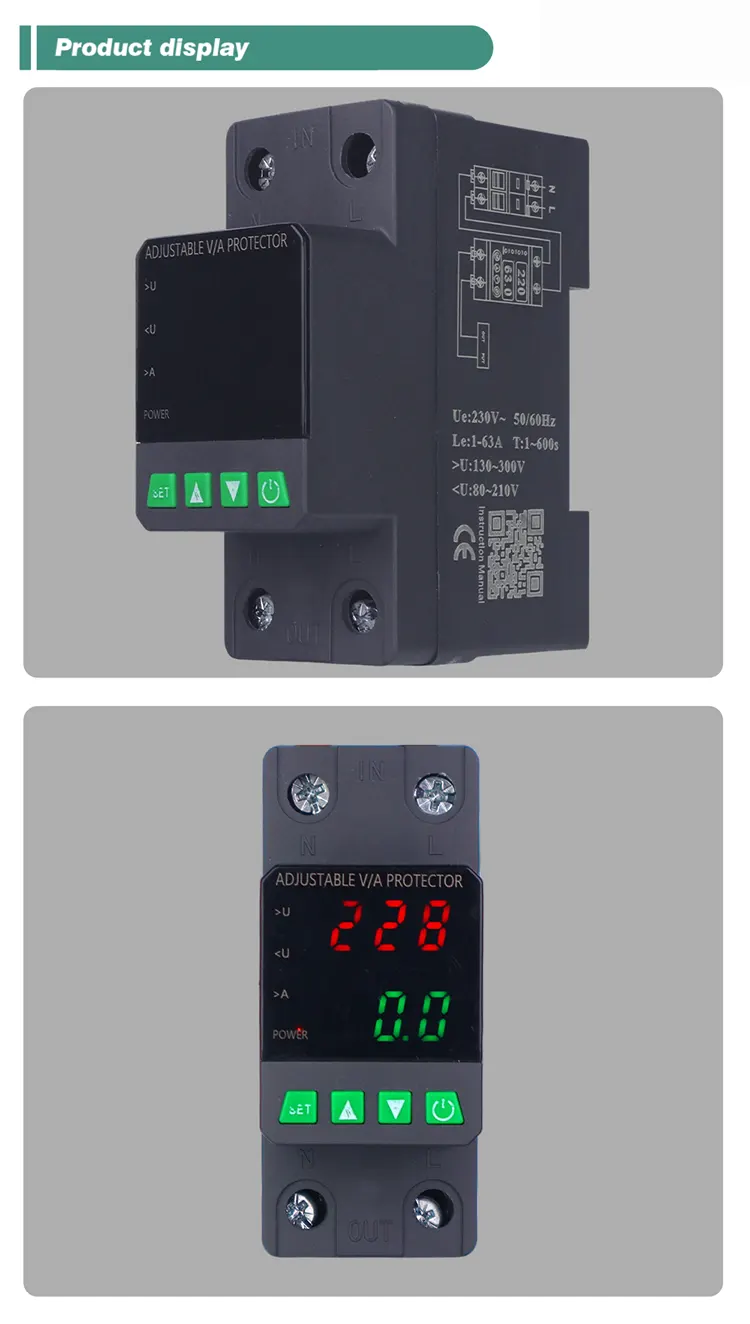 4. இரட்டை காட்சி மின்னழுத்த பாதுகாப்பான் எளிதான தட நிறுவலுக்கான மட்டு வடிவமைப்பைக் கொண்டுள்ளது, அதன் தோற்றத்தையும் செயல்பாட்டையும் மேம்படுத்துகிறது.